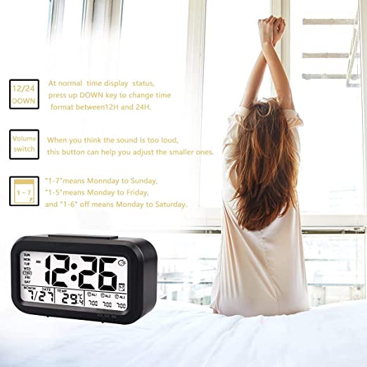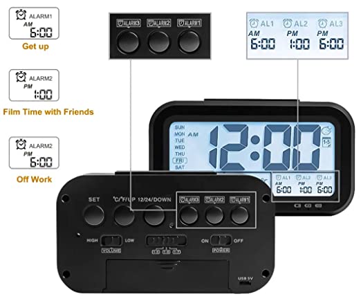 About this item 3 ALARM OPTIONS – Need more alarm options to wake you up? Need more alarm options to remind you do something? Easy to set 3 alarms with this clock, you can see the 3 alarm time on the display clearly. MULTI-FUNCTIONAL – A clock that includes snooze, nightlight, temperature, calendar, voice adjust functions can be your best friend in your daily lifetime. USB RECHARGEABLE – You don’t need to change the battery frequently anymore. This alarm clock by charging fully can be used for month. You can see the low power indication or full power indication clearly at the lower right corner of the clock. 3 WORKDAY MODES – “1-7” means Monday to Sunday, “1-5” means Monday to Friday, and “1-6” off means Monday to Saturday. 3 alarm modes for working day, time, date, alarm. ELEGANT DESIGN – Elegant and concise design with super big display and numbers. Easy to read for all age group in far distance, Additional on-screen information includes month, date, alarm setting, and indoor temperature.