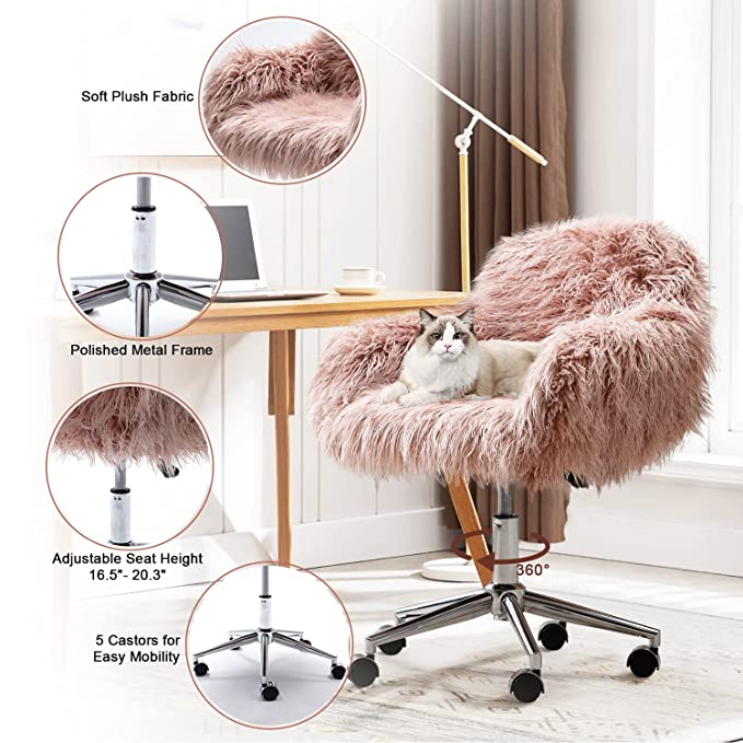 Colour: Pi olour Pi ra DKLGG tyle Moder pecial Feature Swivel, Adjustable_Height aterial Faux Fur, Metal ecomme ed Uses For Product Office oom Type Office, Bedroom, Livi Room rame Material Metal ge Ra e (Descriptio Adult et Qua ity 1.0 cou ee less bout this item ersatile & Fashio ble Faux Fur Desk Chair: Stylish a fuzzy to the touch, this versatile a fashio ble pi fur desk chair takes the bori out of typical home or professio l office seati . Crafted o metal frame, this faux fur desk chair features shaggy faux fur upholstery to put some fu i o your work, a a sleek, silver fi sh that compleme s a color scheme i your space. Make every day a little more fu uper Sturdy & Durable Faux Fur Desk Chair: This chair for bedroom desk is t all about good looks either. The girl room desk chair is crafted from a high quality faux fur fabric, metal frame a sturdy legs which is very solid a durable that ca withsta the weight up to 250 lbs a wear very well to offer lo lasti durability for ma years. omfy Seati Experie e Faux Fur Desk Chair: The pi faux fur upholstery provides you with a comfy seati experie e. Made by skilled craftsme the seat itself is li d with fi faux fur for a soft, glam feel, while high de ity foam fill provides extra paddi . Soft to touch shaggy faux fur upholstery make this makeup chair more moder a stylish. The plush va ty chair ca be put o the livi room/bedroom as home office chair/ makeup stool/childre remote lear chair. otate 360 Degrees & Easy Movi 5 Wheels Faux Fur Desk Chair: Five double wheel casters gives you easy mobility, while a 360 degree swivel tech que keeps you movi while you work. The fuzzy side chair‘s adjustable height lets you sit comfortably, which mi mizes ck strai stiff shoulders, a backaches. The faux fur pi desk chair has a spacious seat a adjustable height betwee 16.53” 20.27” with the chair’s o touch height adjustme lever to suit your eds. asy Assembly & Mai e e Faux Fur Desk Chair: Everythi you ed is efficie ly packed i o your package ll parts, tools a i tructio are i luded for easy, o perso assembly i u er 10 mi s. Brush it to fluff up the faux fur whe taki out the faux fur chair. Mai e e is also very easy, just wipe the pi furry chair with a slightly moiste d cloth, a the choose a site that’s well ve ilated for air dryi without direct heat or su