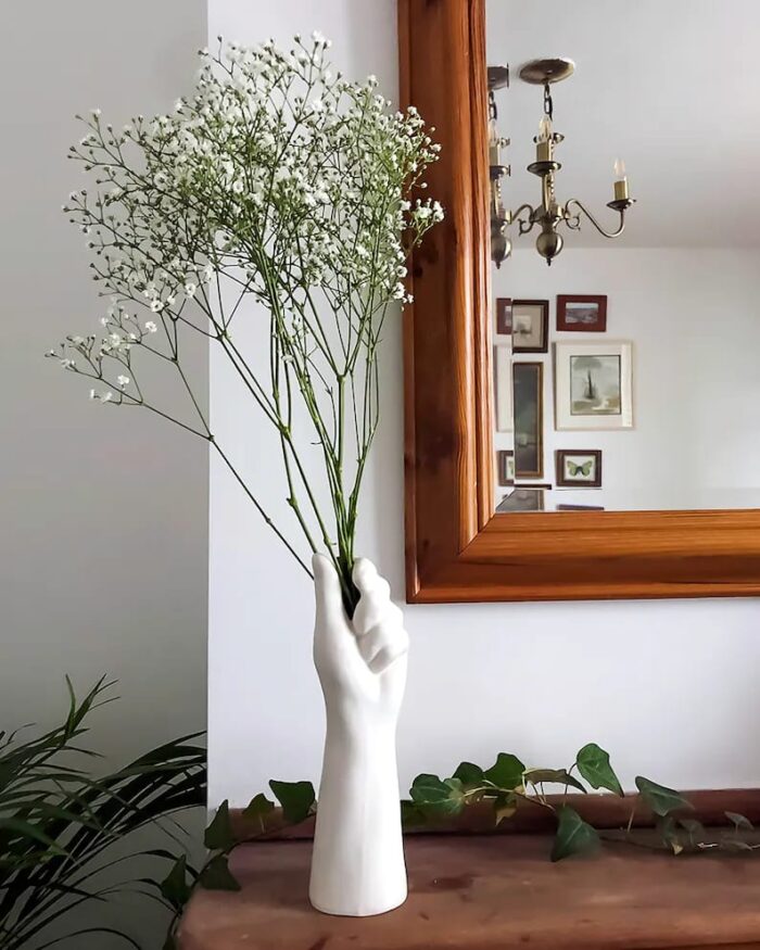 This is a unique design of flower vase that will make it look amazing even without flowers in it.It is available in 3 colors- white, blue, and grey.This statement vase can be the focal point for the interior design of the rest of your house.The design resembles a hand offering flowers to a beloved. It can be ideal for gifting purposes.The Artment is one of the leading home decor brands, that creates unique designs which are eye-catching and utilitarian in nature and a worthy investment for your home.Hand Me The Flowers is a gorgeous addition to your home decor. It can be displayed in the show cabinets or set on the foyer table. This flower vase’s unique design is going to add an x-factor to your decor.