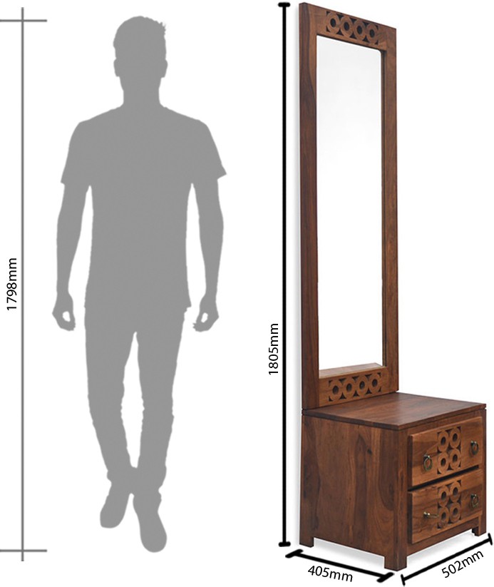 Specifications of @home Annulus Solid Wood Dressing Table (Finish Color – Walnut) Installation & Demo Installation & Demo Details Installation and demo for this product is done free of cost as part of this purchase. Our service partner will visit your location within 72 business hours from the delivery of the product. In The Box 1 Dressing Table General Brand @home Suitable For Bedroom Storage Included Yes Delivery Condition Knock Down Model Number FLDRANNULUSTBHMWLT Model Series Name Annulus Style Vintage & Imperial Stool Included No Bush Included No Care Instructions Avoid Direct Exposure to Sunlight Avoid Sharp Edges Finish Type Polished Important Note Cancellation NOT allowed for this product after 24 hrs of order booking. Warranty Covered in Warranty Asthetic Defects Service Type Customer Need To Call Service Center Warranty Summary 1 Year Warranty Not Covered in Warranty Physical Damage Water Damage Dimensions Mirror Width 508 mm Weight 60 kg Mirror Height 1359 mm Height 1805 mm Width 502 mm Depth 405 mm Disclaimer – The color of the product may vary slightly compared to the picture displayed on your screen. This is due to lighting, pixel quality and color settings – Please check the product’s dimensions to ensure the product will fit in the desired location. Also, check if the product will fit through…View More – The color of the product may vary slightly compared to the picture displayed on your screen. This is due to lighting, pixel quality and color settings – Please check the product’s dimensions to ensure the product will fit in the desired location. Also, check if the product will fit through the entrance(s) and door(s) of the premises – Please expect an unevenness of up to 5 mm in the product due to differences in surfaces and floor levels – Flipkart, or the Seller delivering the product, will not take up any type of civil work, such as drilling holes in the wall to mount the product. The product will only be assembled in case carpentry assembly is required – In case the product appears to lack shine, wiping the surface with a cloth will help clear the surface of dust particles Material & Color Primary Color Brown Primary Material Solid Wood Finish Color Walnut Primary Material Subtype Rosewood (Sheesham)