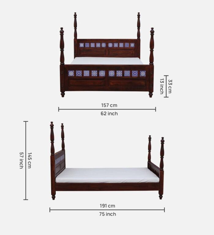 BrandMudramarkDimensions(In Inches)H 57 x W 62 x D 75Weight75 KGColourHoney OakWarranty36 Months’ WarrantyAssemblyCarpenter AssemblyPrimary MaterialSheesham WoodRoom TypeBedroomCollectionKamchiniStorageNo StorageSeating Height13Recommended Mattress Size78 L x 60 W InchDimensions (In Centimeters)H 144.8 x W 157.5 x D 190.5