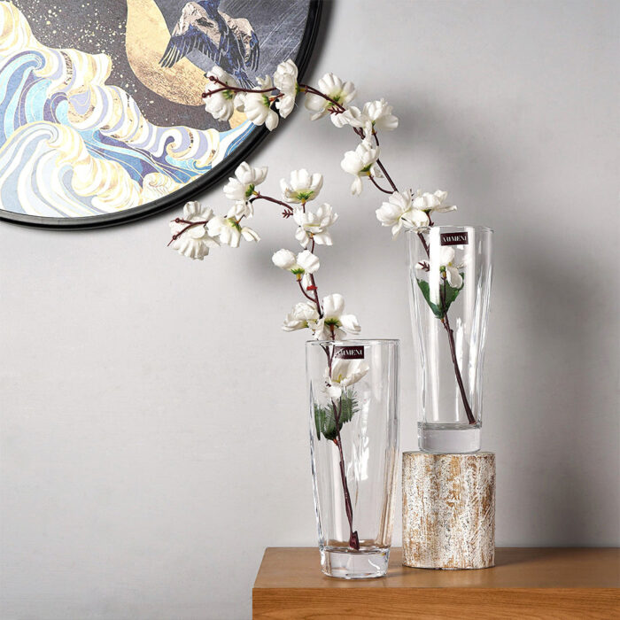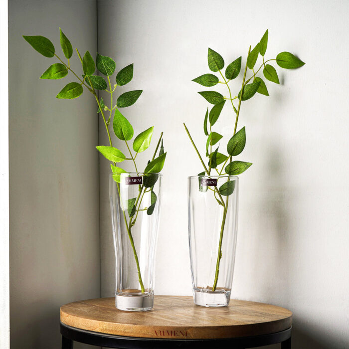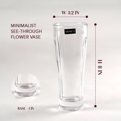 After every use, wash it with normal tap water, and clean it dry with a cotton cloth. Do not use it in a dishwasher.Handcrafted by Indian craftsmen, this glass vase is simple and delicate and lets the flowers in them shine, while taking a backseat. This glass vase set of 2 measures 8 inches by 3.2 inches. It has a 1 inch thick base, that prevents any seepage or slippage.The vases are sent individually wrapped triple layering of bubble wrap and safely packed in a box.These glass vases can be used to decorate your home, offices, or cafes. It is also ideal for gifting.The Minimal See-Through Flower Vase is part of our minimalism collection. They are made of the finest glass, handcrafted by Indian glassmiths. Slender, subtle, and sleek, this vase pair will be the ideal accompaniment for vibrant flowers. These gorgeously shaped vases can easily hold long-stemmed flowers.
