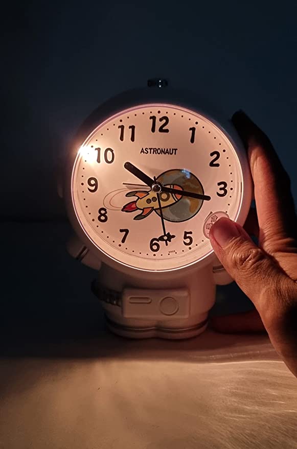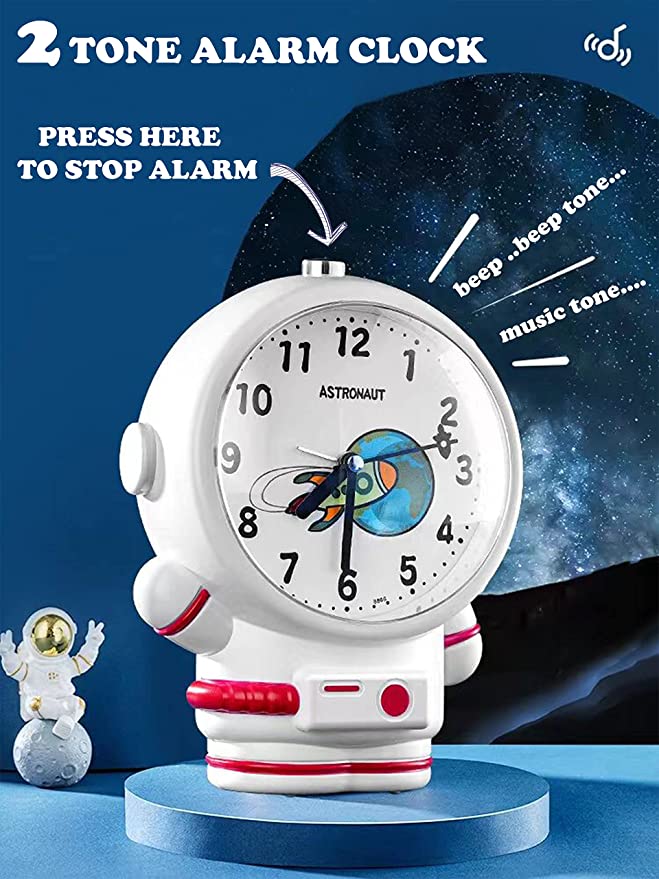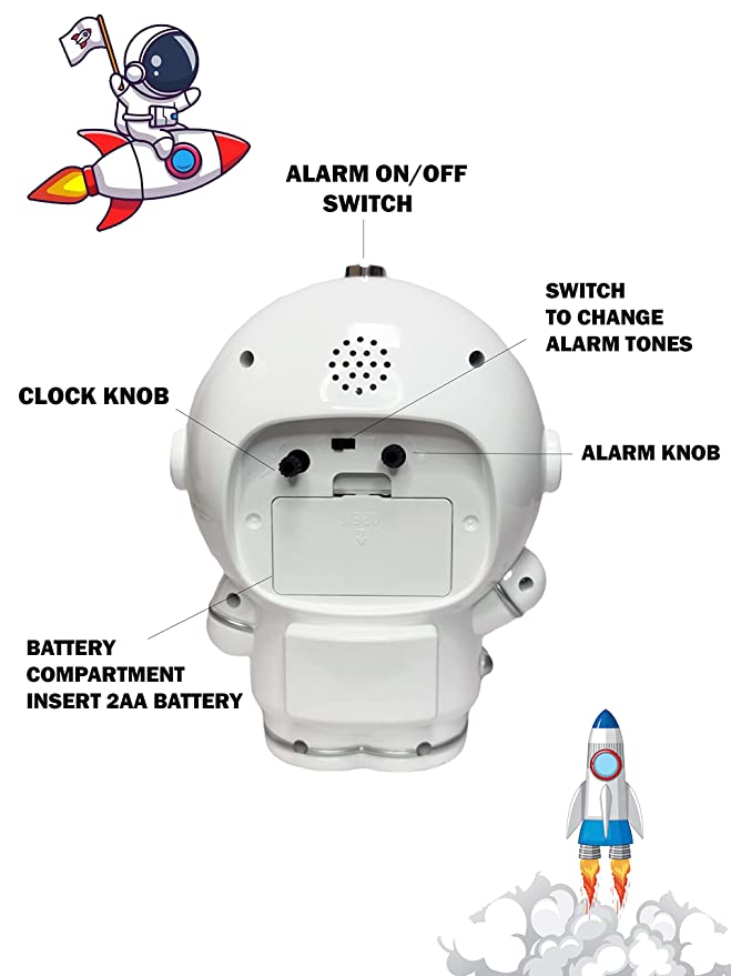 About this itemCute astronaut shape design can be an elegant decoration even if you don’t need to use it. Children’s night light alarm clock is made of safe ABS material, which is very suitable for bedroom, children’s night light, relaxation, outdoor camping.This children’s alarm clock features a space rocket shaped sweeping second hand, which is completely silent, allowing your child to fall asleep quickly without affecting the sleep quality.2 different alarm tones – Beep..Beep and Music Tone, you can choose one between bothPress screen to switch on the night light. Light will automatically switch off after 5 seconds.Alarm off button is placed on top of the Astronaut head.Great Gift! Astronaut Space night lamp alarm table clock makes a great gifts for space fans and is great for the imagination for kids of all ages – boys, girls, and, friends and family as a birthday gifts