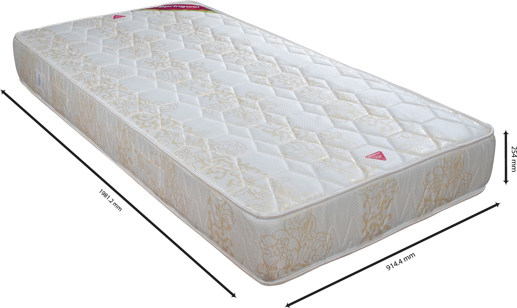 Key Features of Springwel Single Spring Mattress High tensile steel springs,Springwel Single Spring Mattress (1981.1999999999998 X 914.4 X 254 mm) Price: Rs. 16,871 Springwel Comfort Collection is made to give you healthy sleep with unmatched comfort. Its numerous high tensile steel springs give proper support to body contours and also retain spine in its natural S shape. Further it enhances sleeping experience with proper support and added comfort. Best of all, it comes with all round PU foam padding that gives edge-to-edge support and more sleeping surface. INTERNAL CROSS SECTION :- A. Premium Quality Jacquard Fabric with Chain stitched Quilting B. High Density PUF Sheet as Comfort Layer C. Needle Loom Felt for added Comfort and Durability D. High Density Rubberised Coir Sheet as Support Layer E. High Quality Polypropylene Mesh as Insulator F. High Tensil, Bonnell Springs made on Swiss Machines���,Specifications of Springwel Single Spring Mattress (1981.1999999999998 X 914.4 X 254 mm) In The Box 1 Mattress Important Note Cancellation NOT allowed for this product after 24 hrs of order booking. General Brand Springwel Orthopaedic Support No Type Spring Reversible Mattress Yes Reinforced Edges No Filling Material Bonnel Spring Thickness 254 mm Color Beige Pillow Top No Model Number ComfortCollection_Crown_Size-78x36_Thickness-10 Model Series Name Comfort Collection Layers Multi Layer Length 1981.1999999999998 mm Width 914.4 mm Care Instructions Periodically rotate and flip mattress to retain it’s shape, Clean spots/spills with mild detergent and wait till it fully dries up Size Single Dimensions Weight 23 kg Warranty Covered in Warranty Manufacturing defect and warranty Limited to sagging, crumbling & natural disintegration of only core , under normal conditions of domestic use. Warranty Summary upto 10 years Service Type Onsite not applicable Not Covered in Warranty Excludes losses resulting form natural wear, improper maintenance, wrong handling, excessive loading, negligence in use, folding of mattress and unsatisfactory foundation. Gaurantee/warranty does not cover fabric damage. Disclaimer – The color of the product may vary slightly compared to the picture displayed on your screen. This is due to lighting, pixel quality and color settings – Please check the product’s dimensions to ensure the product will fit in the desired location. Also, check if the product will fit through…View More – The color of the product may vary slightly compared to the picture displayed on your screen. This is due to lighting, pixel quality and color settings – Please check the product’s dimensions to ensure the product will fit in the desired location. Also, check if the product will fit through the entrance(s) and door(s) of the premises – Please expect an unevenness of up to 5 mm in the product due to differences in surfaces and floor levels – Flipkart, or the Seller delivering the product, will not take up any type of civil work, such as drilling holes in the wall to mount the product. The product will only be assembled in case carpentry assembly is required – In case the product appears to lack shine, wiping the surface with a cloth will help clear the surface of dust particles