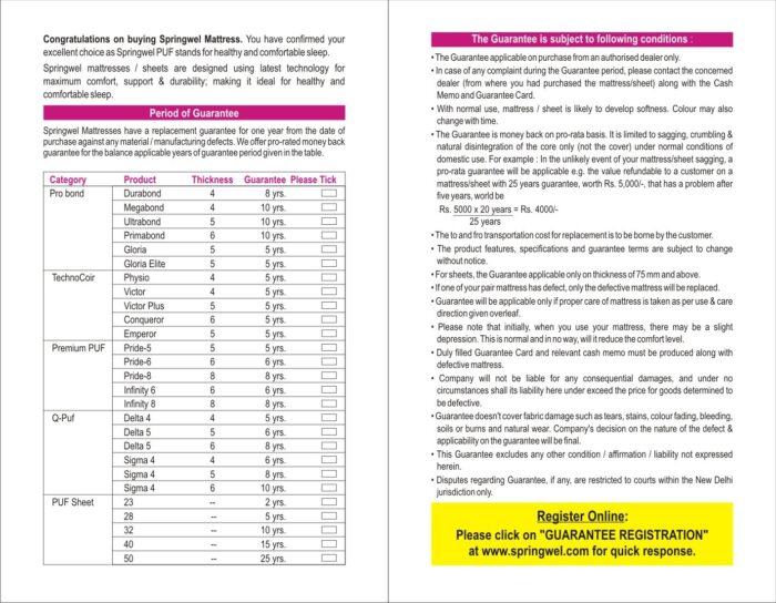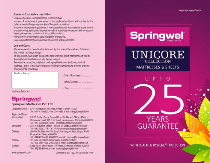 Specifications of Springwel Single Spring Mattress (1981.1999999999998 X 1219.1999999999998 X 152.39999999999998 mm) In The Box 1 Mattress Important Note Cancellation NOT allowed for this product after 24 hrs of order booking. General Brand Springwel Orthopaedic Support No Type Spring Reversible Mattress No Reinforced Edges No Filling Material Rubberized Coir Thickness 152.39999999999998 mm Color White Pillow Top Yes Model Number DivinityCollection_Divinity-6_Size-78x48_Thickness-6 Model Series Name Divinity Collection Layers Multi Layer Length 1981.1999999999998 mm Width 1219.1999999999998 mm Care Instructions Periodically rotate and flip mattress to retain it’s shape, Clean spots/spills with mild detergent and wait till it fully dries up Size Single Dimensions Weight 27 kg Warranty Covered in Warranty Manufacturing defect and warranty Limited to sagging, crumbling & natural disintegration of only core , under normal conditions of domestic use. Warranty Summary upto 6 years Service Type Onsite not applicable Not Covered in Warranty Excludes losses resulting form natural wear, improper maintenance, wrong handling, excessive loading, negligence in use, folding of mattress and unsatisfactory foundation. Gaurantee/warranty does not cover fabric damage. Disclaimer – The color of the product may vary slightly compared to the picture displayed on your screen. This is due to lighting, pixel quality and color settings – Please check the product’s dimensions to ensure the product will fit in the desired location. Also, check if the product will fit through…View More – The color of the product may vary slightly compared to the picture displayed on your screen. This is due to lighting, pixel quality and color settings – Please check the product’s dimensions to ensure the product will fit in the desired location. Also, check if the product will fit through the entrance(s) and door(s) of the premises – Please expect an unevenness of up to 5 mm in the product due to differences in surfaces and floor levels – Flipkart, or the Seller delivering the product, will not take up any type of civil work, such as drilling holes in the wall to mount the product. The product will only be assembled in case carpentry assembly is required – In case the product appears to lack shine, wiping the surface with a cloth will help clear the surface of dust particles