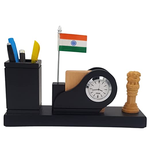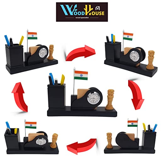 Woodhouse Wooden Pen Stand with Clock for Office Table & Study Table, Wooden Pen Stand with Indian Flag, Ashok Pillar/Ashok Stambh for Office Table Stylish, Beautiful Pen Stand, Wooden Pencil Stand